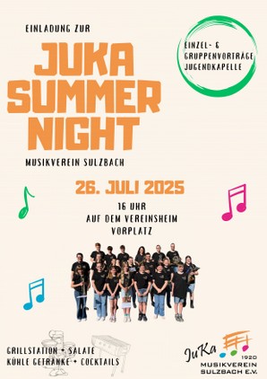 Am Samstag, den 26.07.2025, ab 16 Uhr präsentiert sich die Jugend des MV Sulzbach bei ihrer JuKa SummerNight auf dem Vereinsheimvorplatz. An diesem Abend stellen die jungen Musikerinnen und Musiker ihr Können unter Beweis und spielen in Einzel- und Gruppenvorträge Ihre Lieblingsstücke vor. Auch die JuKa (Jugendkapelle) präsentiert sich ihren Zuhörern.